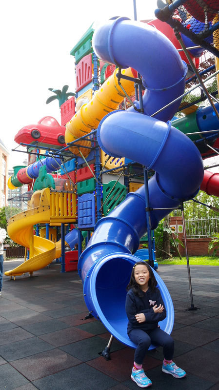 前段左手邊藍色溜滑梯 (旋轉二圈半)
